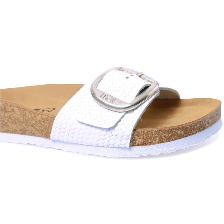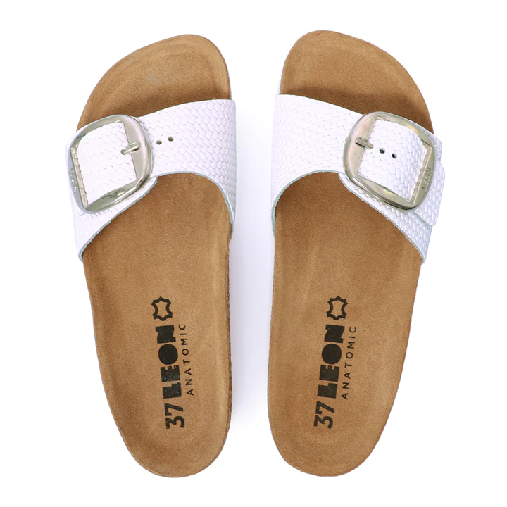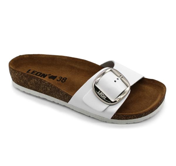 Offene Lederpantoffeln für Damen. Das Obermaterial kann dank der Schnallen an den Fuß angepasst werden. Die Sohle besteht aus anatomisch geformtem Kork mit einer weichen Wildlederdecksohle und einer rutschfesten Schaumstoffunterseite. Empfohlen für den täglichen Gebrauch zu Hause oder auf der Straße, für leichte Sommerspaziergänge (die Füße werden nach mehreren Stunden Gehen nicht müde).