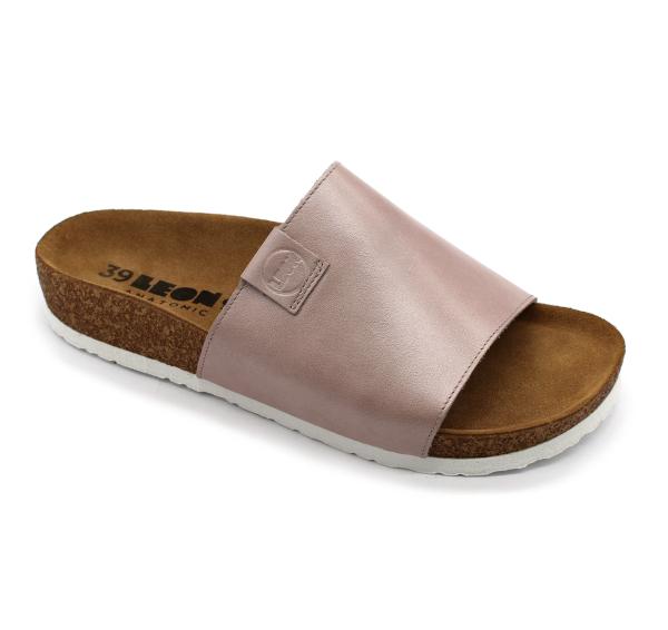 Offener, modischer Damen-Slipper aus Leder mit anatomisch geformter Korksohle, weicher Wildleder-Decksohle und rutschfester Schaumstoffunterseite. Empfohlen für den täglichen Gebrauch zu Hause oder auf der Straße, für leichte Sommerspaziergänge (die Füße werden nach mehreren Stunden Gehen nicht müde)