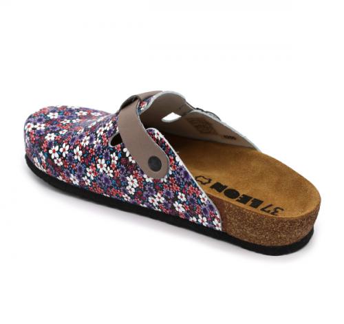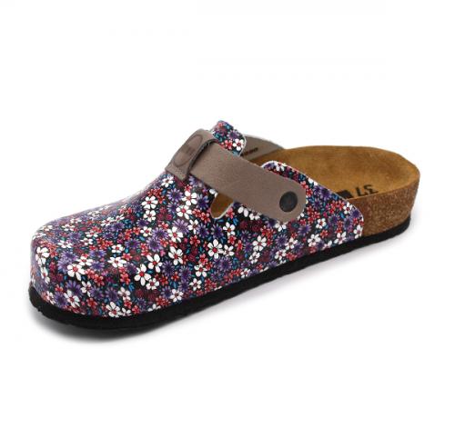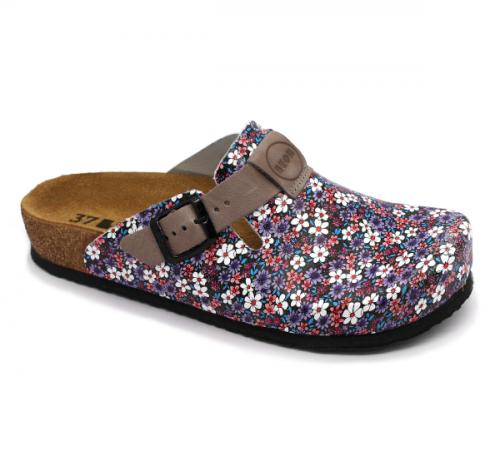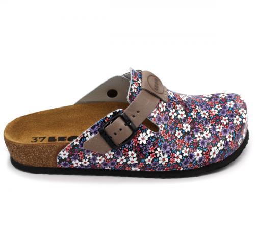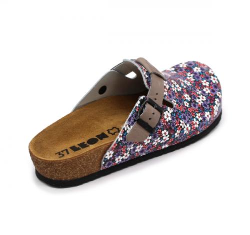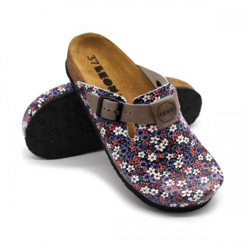 Lederclogs für Damen, seitliche Schnalle zur Kontrolle des Überflusses. Die Sohle besteht aus anatomisch geformtem Kork mit einer weichen Wildlederdecksohle und einer rutschfesten Schaumstoffunterseite. Empfohlen für den täglichen Gebrauch zu Hause oder auf der Straße, für leichte Sommerspaziergänge (die Füße werden nach mehreren Stunden Gehen nicht müde).