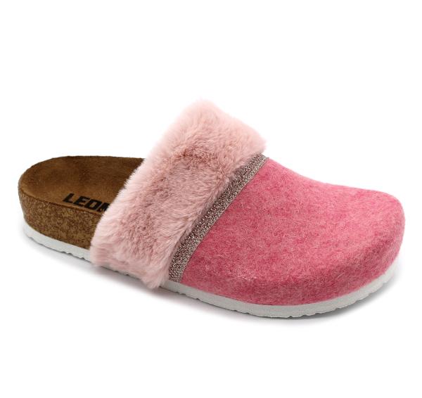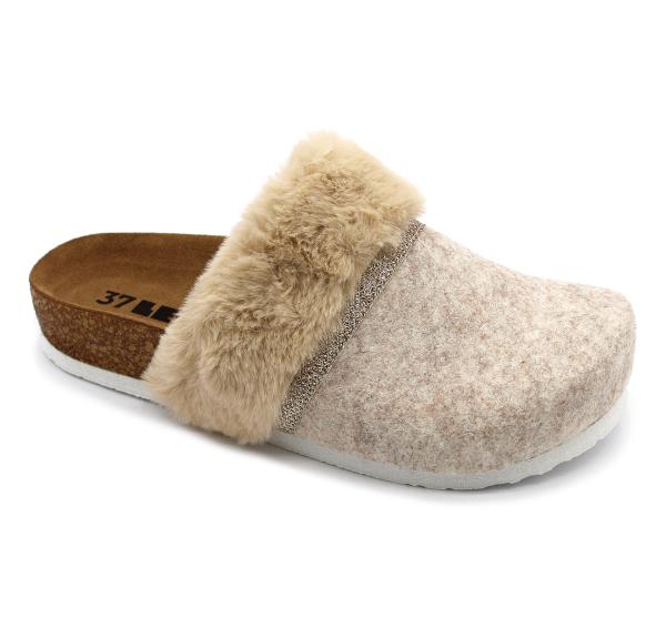 Bequemer Damen-Stoffclog mit anatomisch geformter Korksohle, weicher Wildlederinnensohle und rutschfester Schaumstoffunterseite.