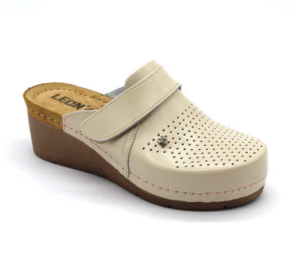 Damenlederclogs mit Kunststoffsohlen. An der Seite befindet sich ein Klettverschluss, um die Fülle einzustellen. Die Innensohle ist weich, Gel, Leder. Durch das natürliche Material und die Perforation des Obermaterials ist er gut belüftet. Entwickelt für den täglichen Gebrauch auf der Straße, zu Hause oder bei der Arbeit (Ihre Füße werden nach stundenlangem Laufen nicht müde).