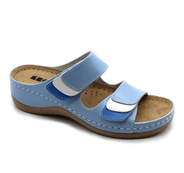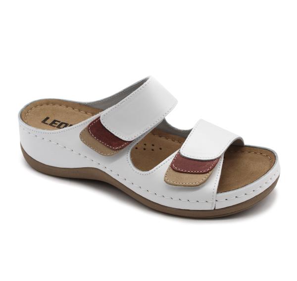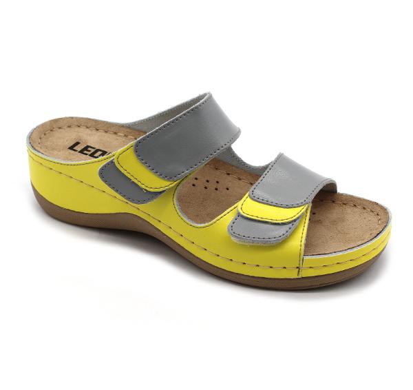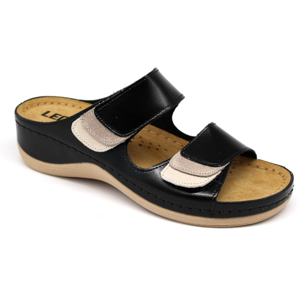 Offene Damenpantoffeln aus Leder mit rutschfester Kunststoffsohle. Beide Riemen sind mit Klettverschluss verstellbar. Die Innensohle ist weiches Gel, Leder. Entwickelt für den täglichen Gebrauch, zu Hause, auf der Straße oder bei der Arbeit (Ihre Füße werden nach stundenlangem Laufen nicht müde).