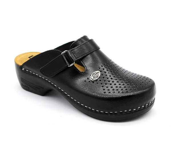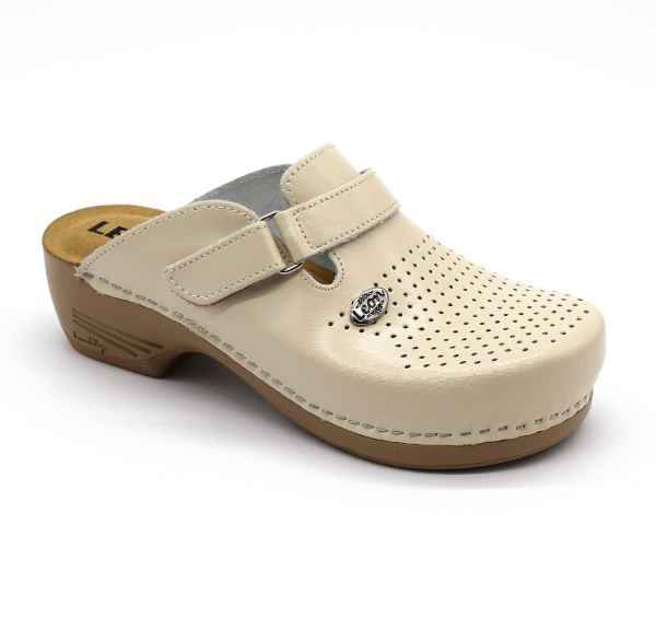 Damenlederclogs mit Kunststoffsohlen. An der Seite befindet sich ein Klettverschluss, um die Fülle einzustellen. Die Innensohle ist weiches, schwammiges Leder. Durch das natürliche Material und die Perforation des Obermaterials ist er gut belüftet. Entwickelt für den täglichen Gebrauch auf der Straße, zu Hause oder bei der Arbeit (Ihre Füße werden nach stundenlangem Laufen nicht müde).
